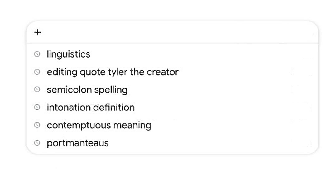 Quote unquote terrible according to socio- and colonial powers, white perfectionism, shoulds and regional linguistics. I was once told, not by my grandpa, I had more street than book smarts but that "wasn't a bad thing - you've read a lot of books too!" I'll take it, if I use too many commas and don’t always know the right use of a semicolin then that was by god’s design. I look up how to spell things, word’s meanings, where to put apostrophes, etc: I am contemptuous to Grammarly. It has to come from my brain first, then I’ll figure it out from there. “Create like a child, edit like a scientist.” - Tyler, the Creator.